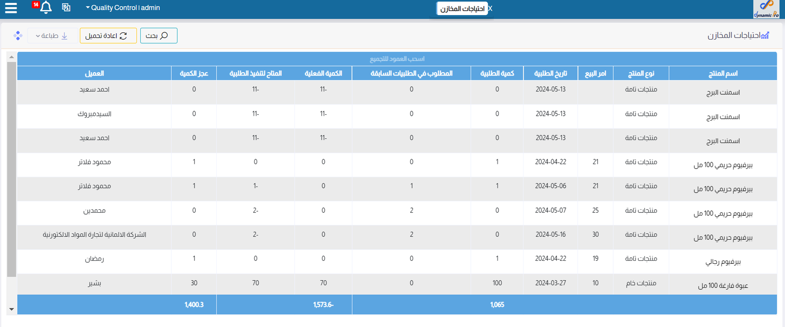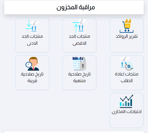 - إمكانية تسجيل ومتابعه حد الطلب على مستوى كل مخزن مع عرض العجز والزيادة .