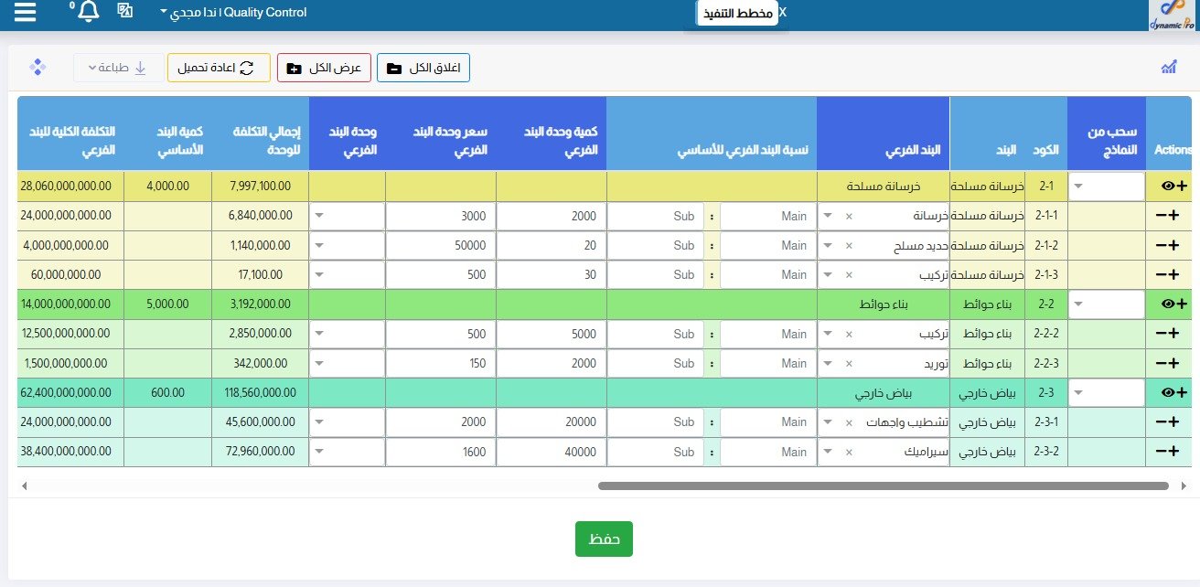 - تسجيل بنود المشروع الإجمالية والفرعية مع استعراض تقارير عن نسب الإنجاز لكل بند .