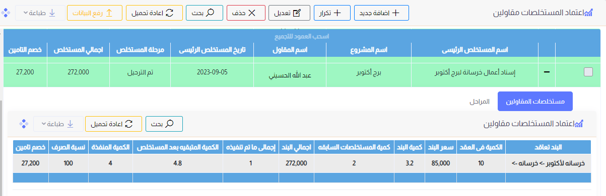 - ضبط كامل لعمليات الخصومات والدفعات المقدمة و تأمينات الأعمال و تسجيل ومتابعة خطابات الضمان مع التوجيه المحاسبى السليم لكافة القيود المحاسبية مجموعة متكاملة من التقارير التى تغطى كافة حركات وارصدة وموقف مقاولى الباطن.
