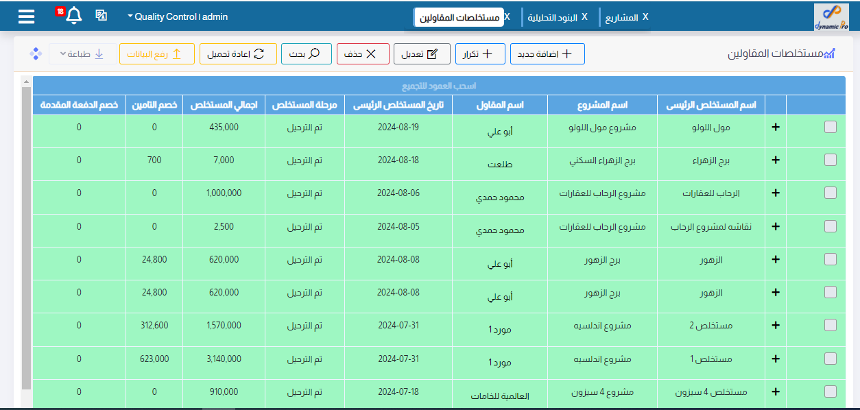 - تسجيل الدوره الكاملة للمشروع بداية من دخول المناقصات وتقديم العروض الفنية والمالية وحتى تسليم المشروعات للعملاء بشكل نهائي.